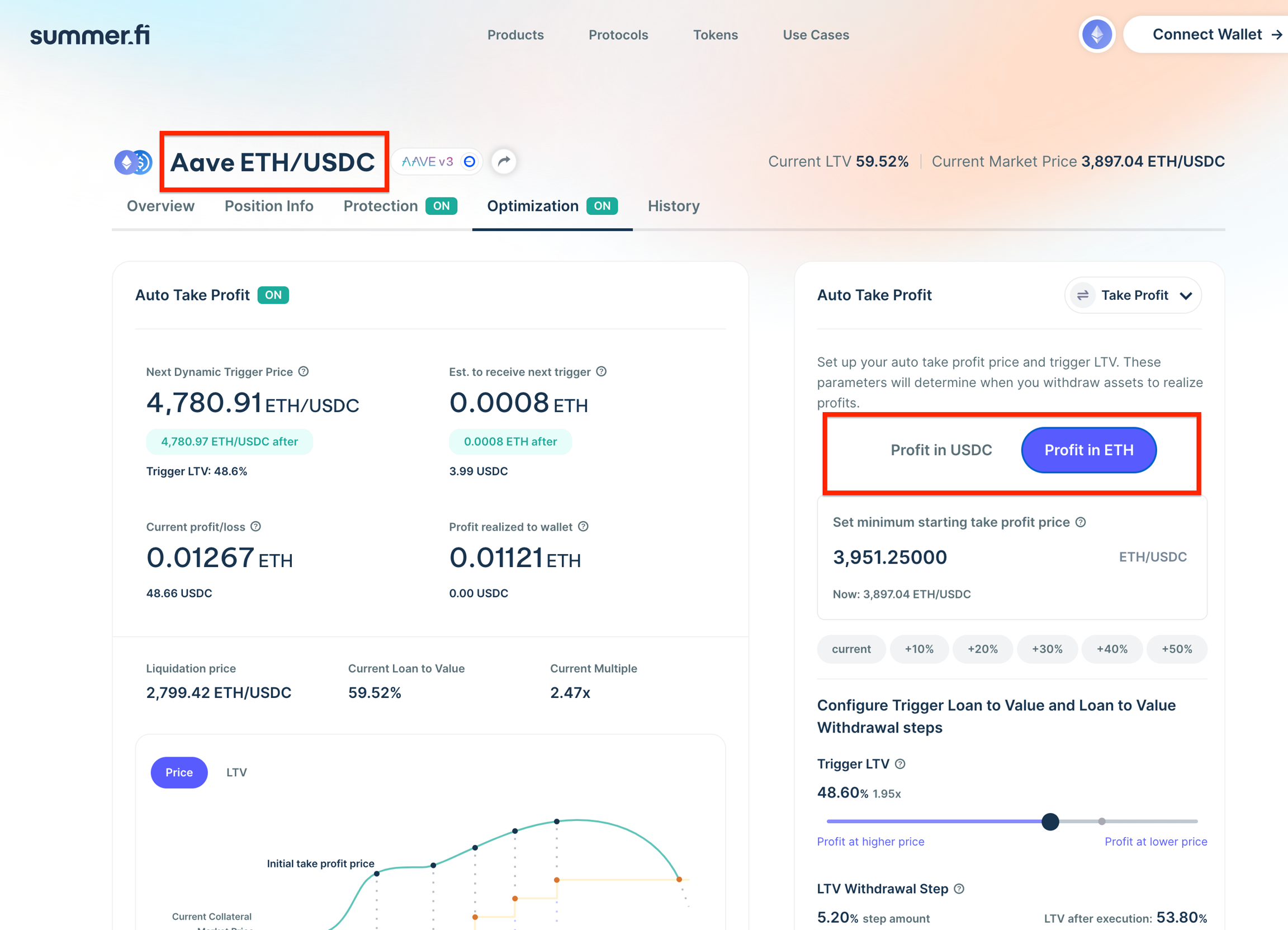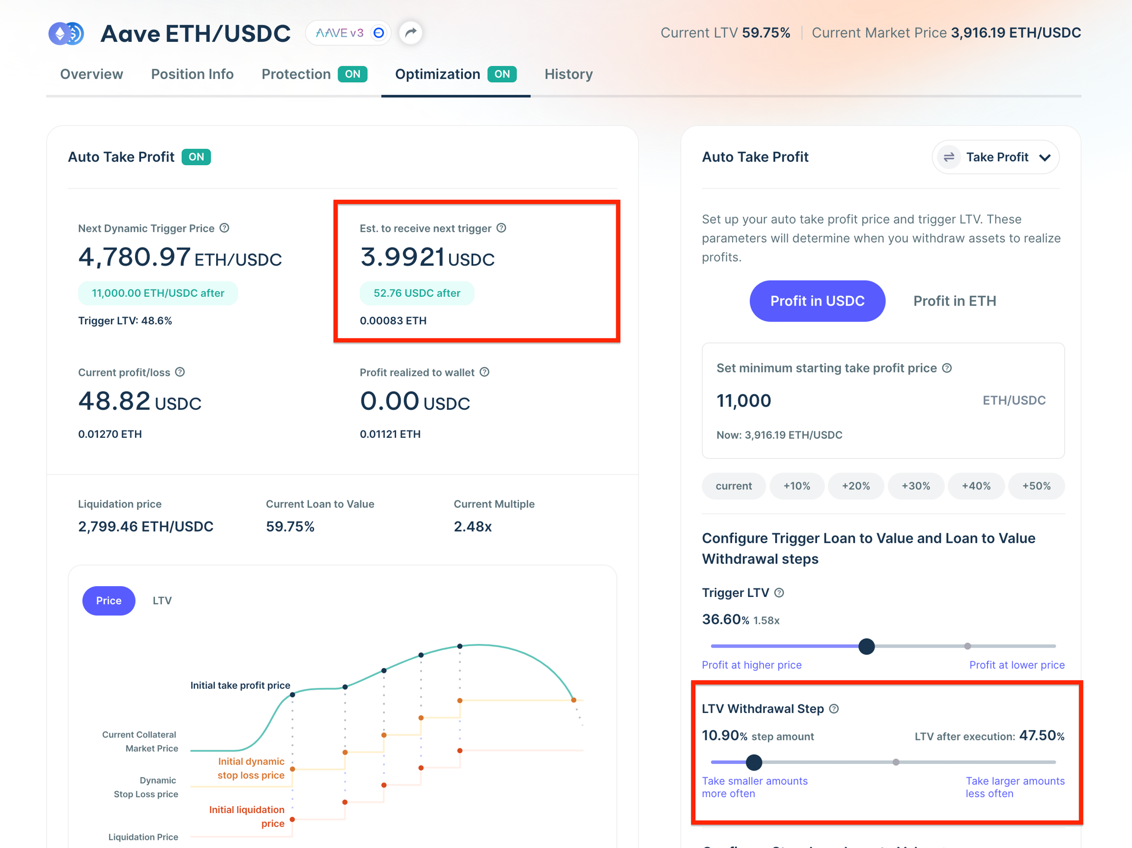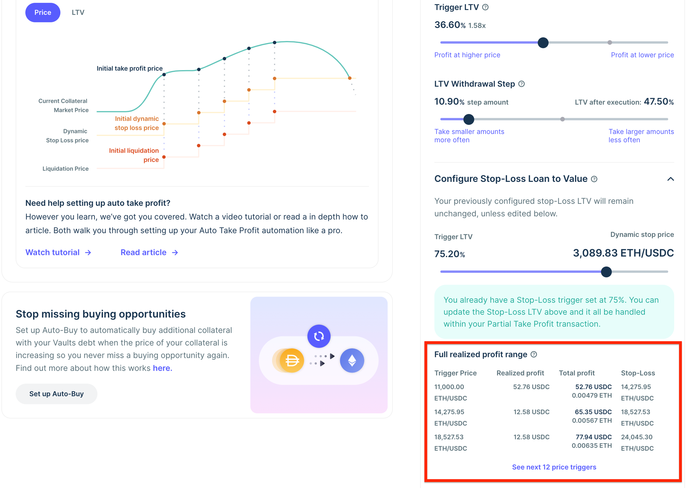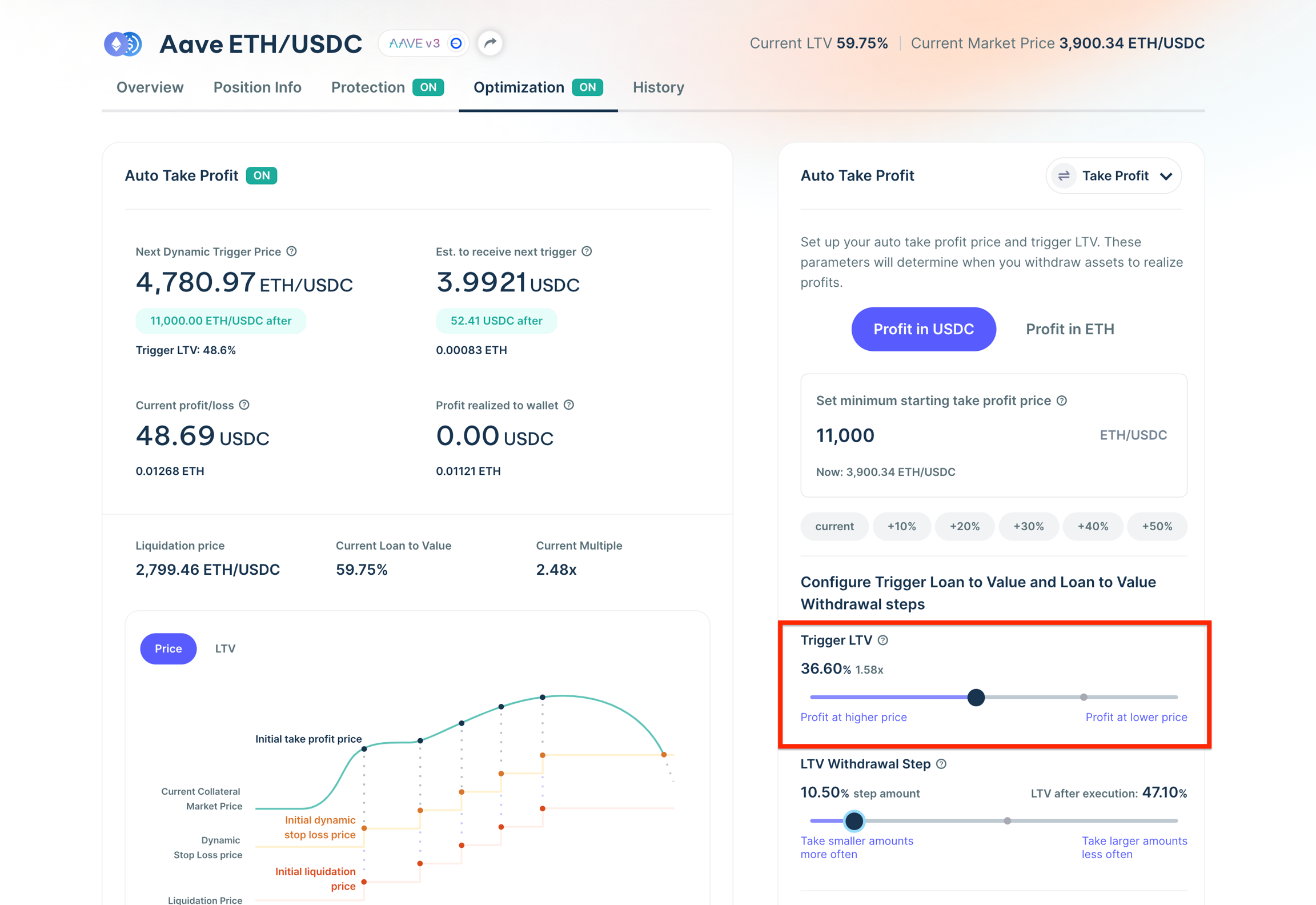 After you have set your minimum starting take profit price, you will need to set a Trigger LTV. This is the constant LTV that will determine when you realize profits after your minimum starting take profit price has been reached.