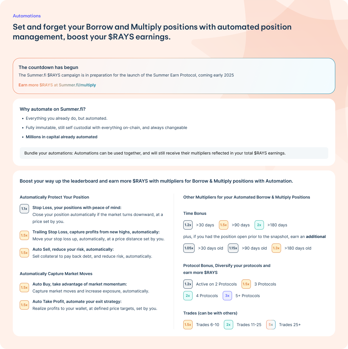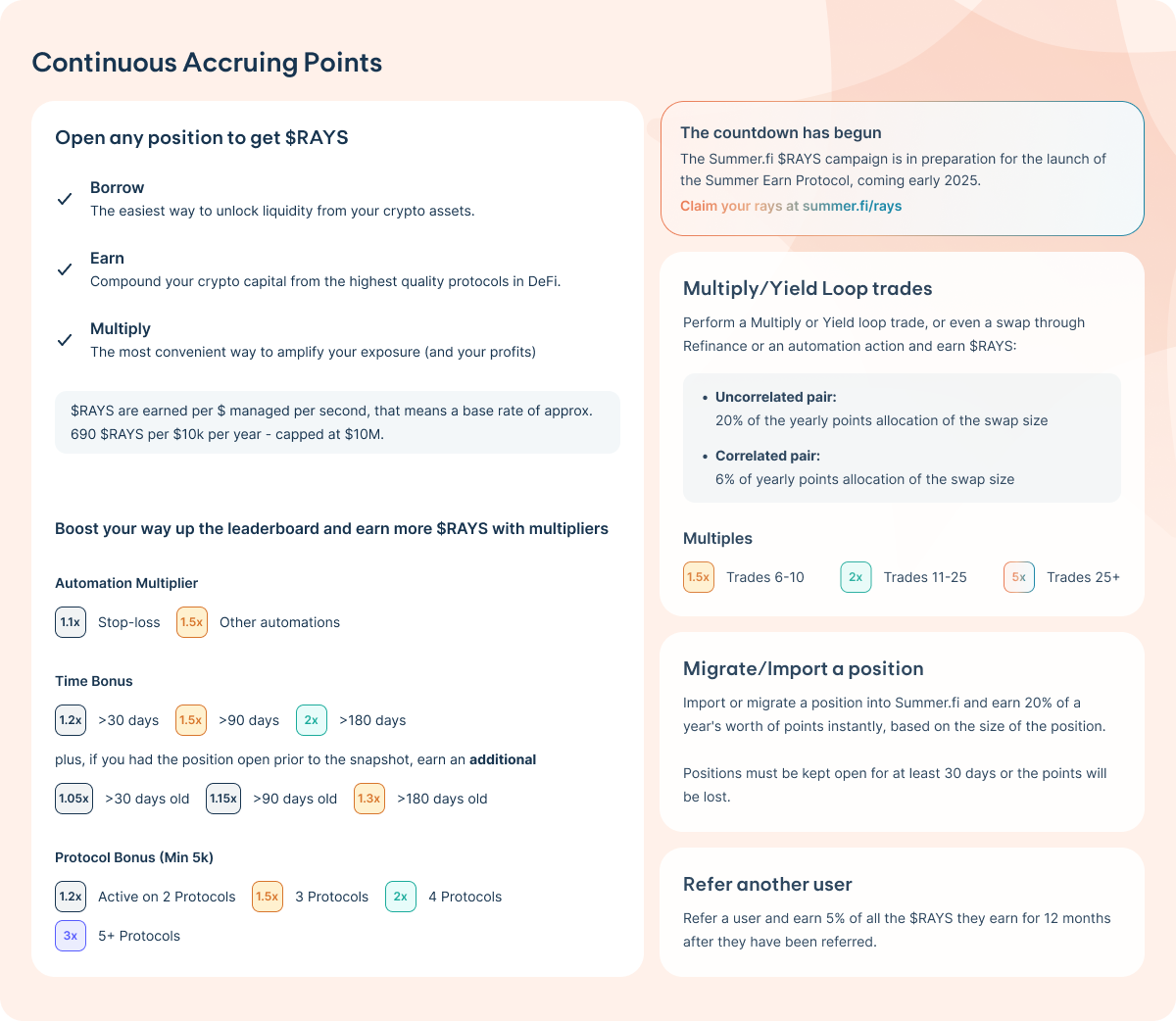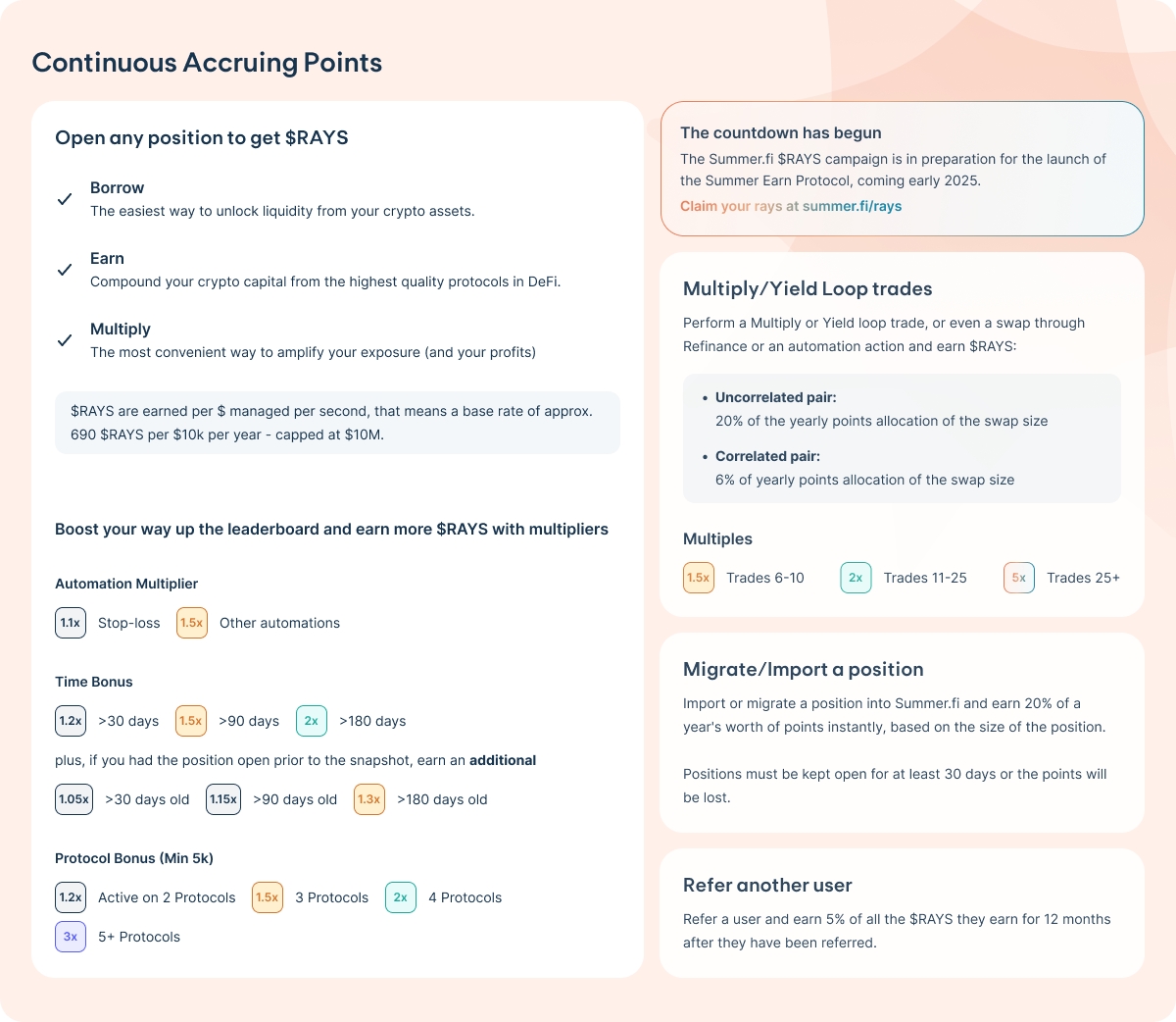 The Summer.fi $RAYS Campaign is in preparation for the launch of the Summer.fi Earn Protocol, coming in early 2025.